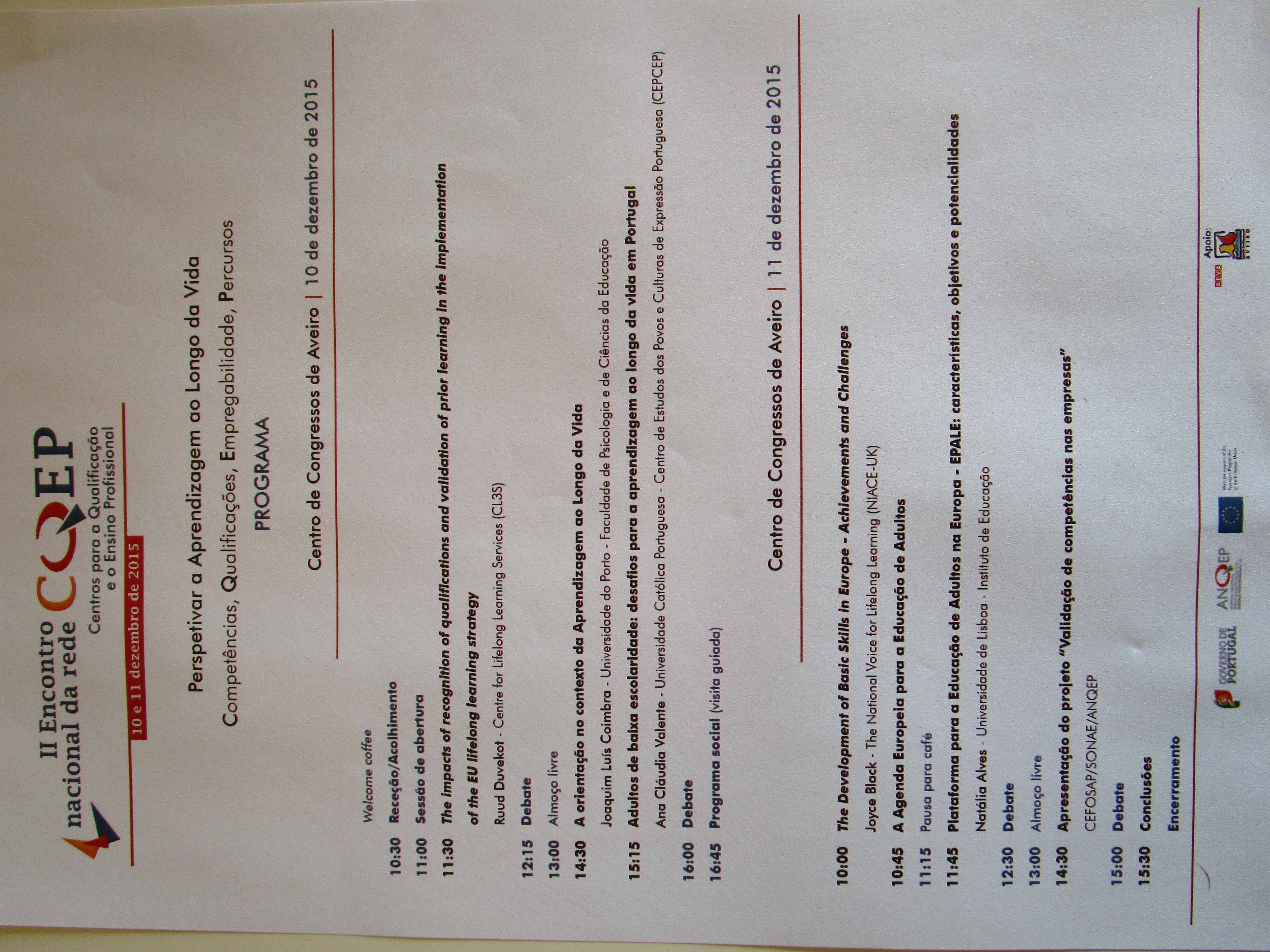 No âmbito do trabalho desenvolvido pelos Centros para a Qualificação e o Ensino Profissional (CQEP), realizou-se, nos dias 10 e 11 de dezembro, no Centro de Congressos de Aveiro, o II Encontro Nacional da rede CQEP, sob o lema "Perspetivar a Aprendizagem ao Longo da Vida - Competências, Qualificações, Empregabilidade, Percursos". Estiveram presentes elementos das equipas dos CQEP, bem como especialistas no domínio da educação e formação de adultos, representantes de empresas e parceiros sociais. O primeiro dia foi especialmente dedicado a temáticas vocacionadas para o trabalho dos CQEP. No segundo, a discussão foi aberta a outros parceiros e aos temas da Agenda Europeia para a Educação de Adultos e da Plataforma Eletrónica para a Educação de Adultos na Europa (EPALE). |